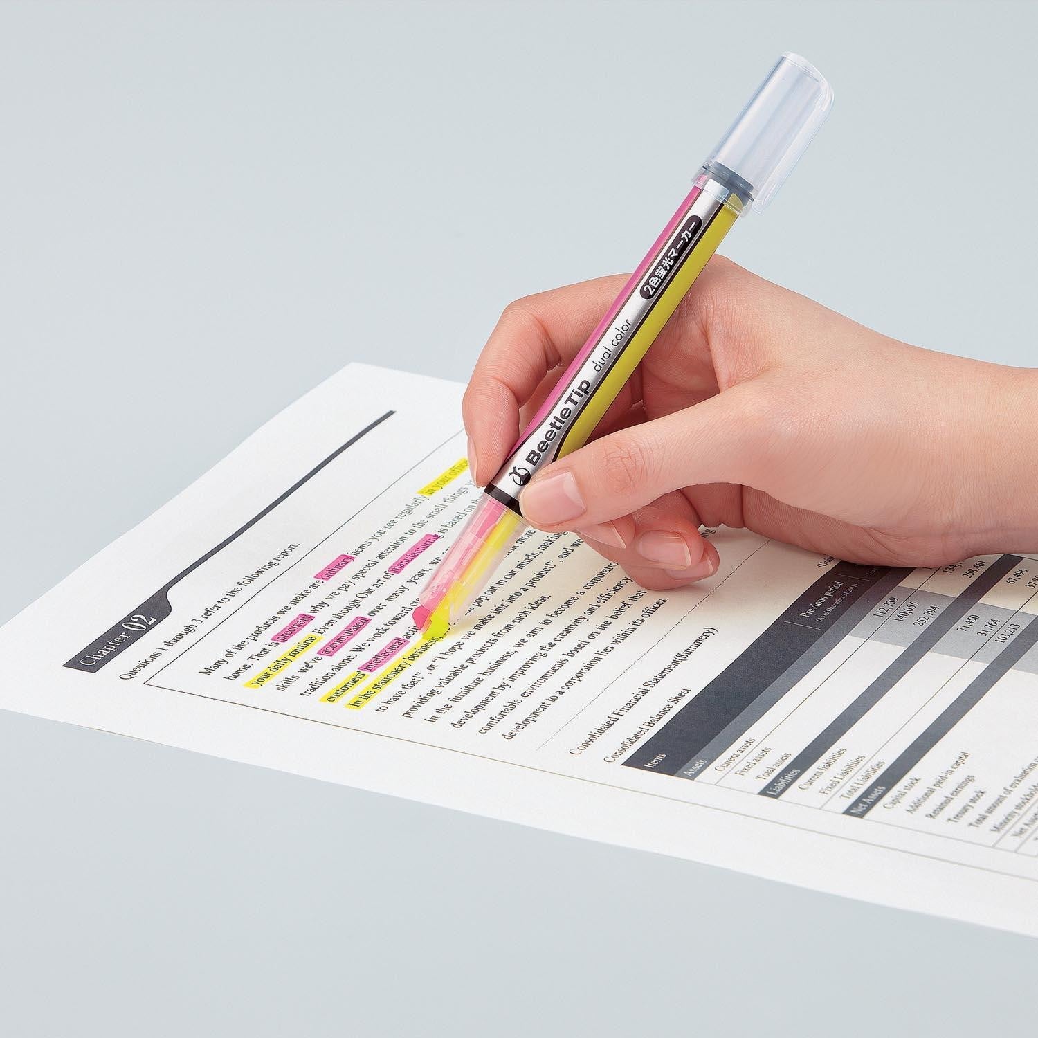 Un subrayador con el que poder utilizar dos colores a la vez, esto permite marcar eficientemente sin interrumpir tu proceso de pensamiento.