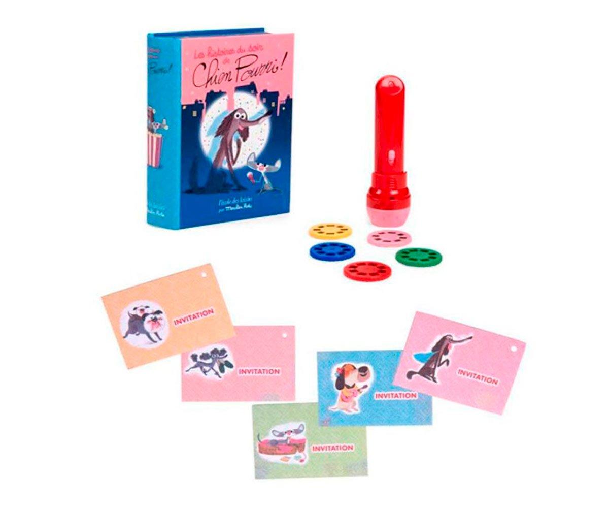 Un libro con linterna proyector con 5 discos con diferentes historias de Perro Apestoso y 5 tarjetas postales. Se puede usar la cubierta interior del libro como pantalla para proyectar, y las pequeñas invitaciones para invitar a tus amigos a la proyección.