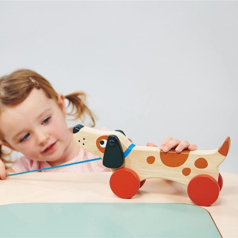 Este cachorro de juguete viene con una cuerda para tirar, ruedas rojas y orejas giratorias.