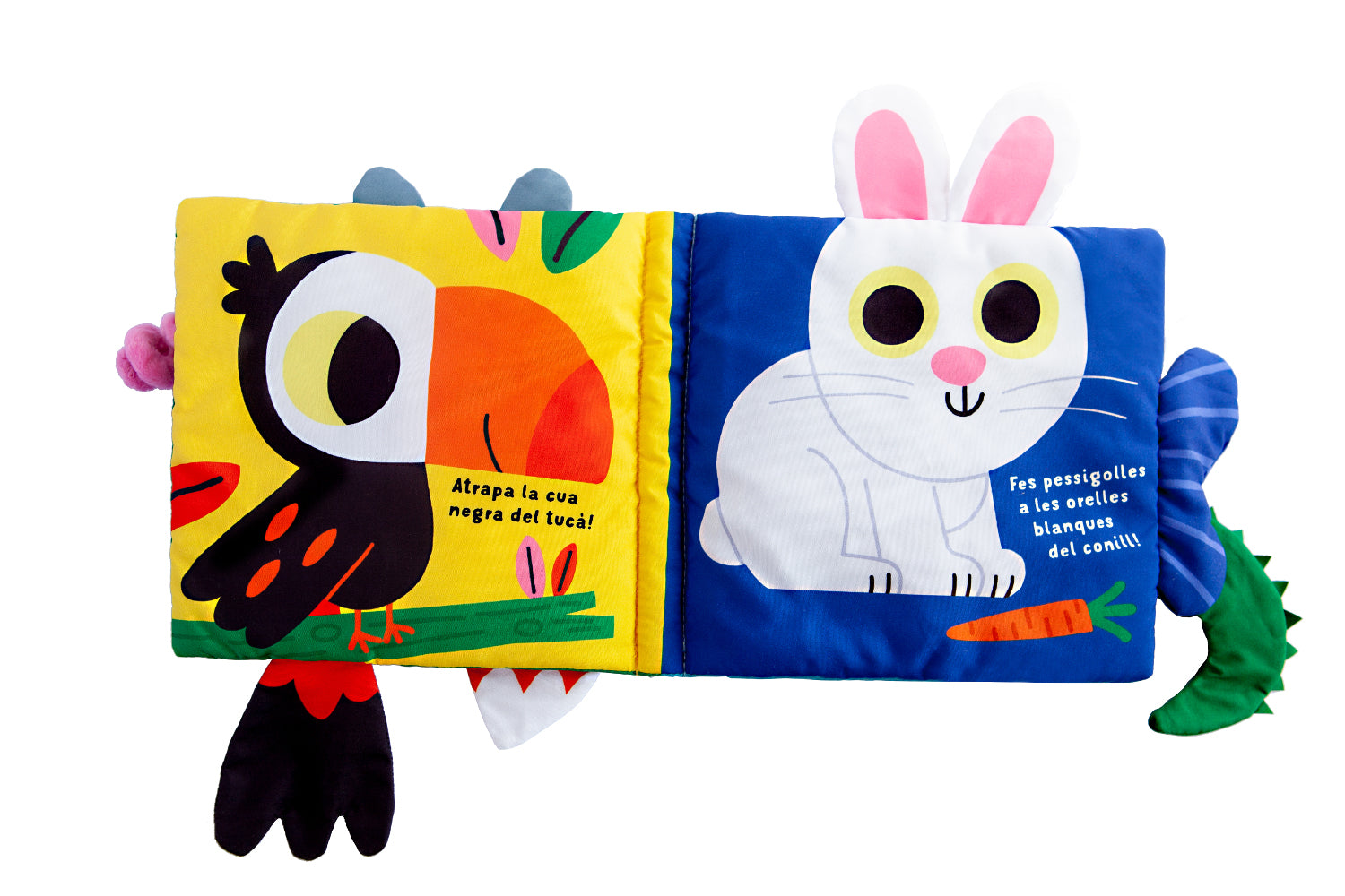 Un libro de tela de Marion Billet para estirar y acariciar, con colas y orejas de varios animales que sobresalen de las páginas. ¡Un libro original y atractivo, perfecto para las manos pequeñas!