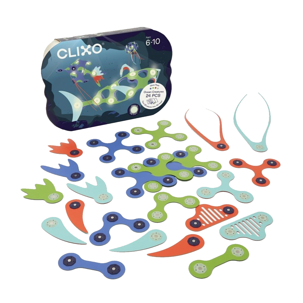 El pack Ocean Creatures contiene piezas nuevas y especiales. Aletas y tentáculos de CLIXO que brillan en la oscuridad dan vida a las maravillas submarinas. Lleva la inspiración creativa a lo más profundo, fomenta el aprendizaje STEAM y crea infinitas criaturas submarinas. El pack contiene 24 piezas en 9 formas únicas de CLIXO.