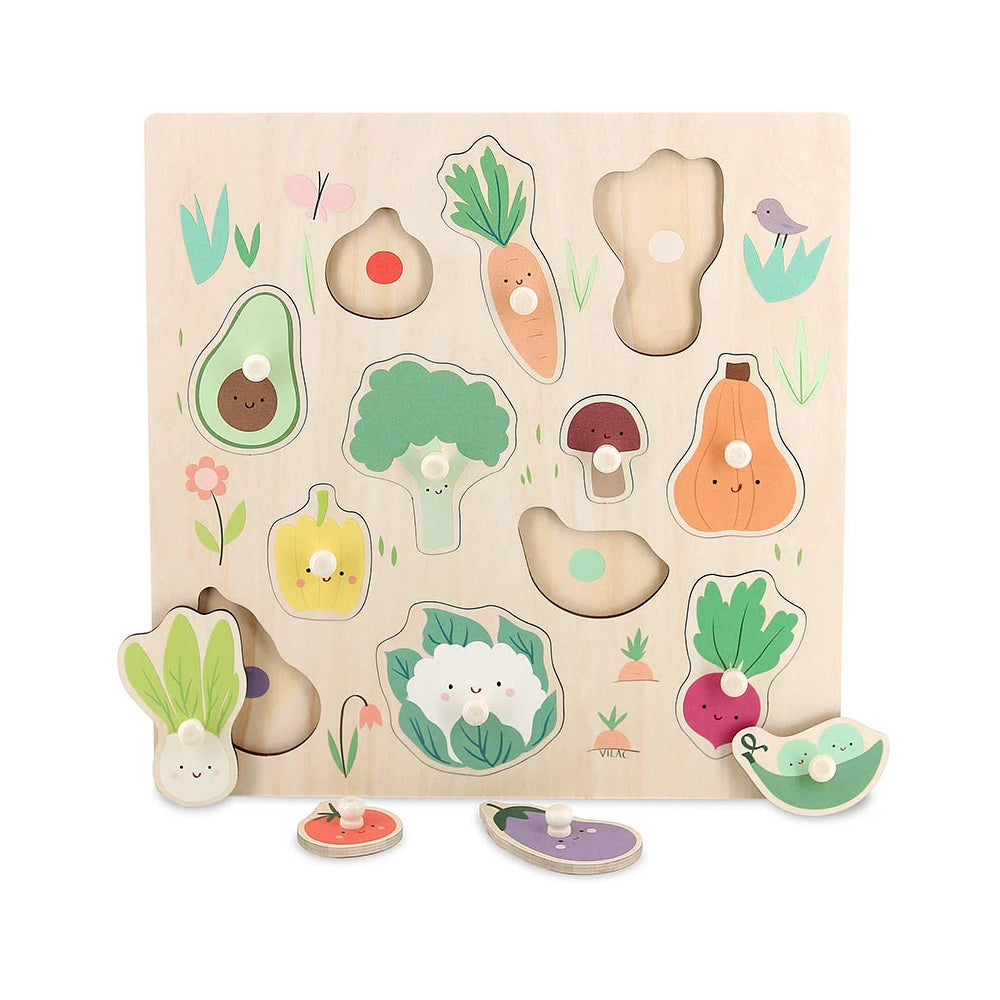 Este puzle de 12 piezas con clavijas de madera adaptado a las pequeñas manos de los niños es un gran apoyo para el desarrollo de la motricidad fina de lxs niñxs. El juego estimulará la capacidad de pensamiento y observación. Como ayuda adicional para colocar las verduras, se colocan pequeños puntos de colores en la base del puzle. Ilustrado por Sarah Betz.