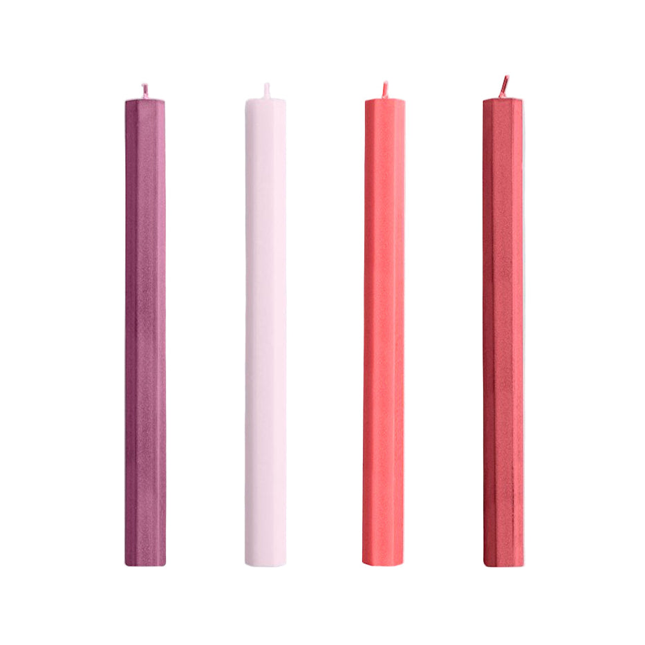 Con una elegante forma hexagonal y un acabado mate, estas coloridas velas están diseñadas para lucirse tanto en grupo como individualmente. Cuentan con la certificación Nordic Swan Ecolabel y su duración es de aproximadamente 7 horas. Vienen en una bonita caja de cartón y en pack de 4 velas.