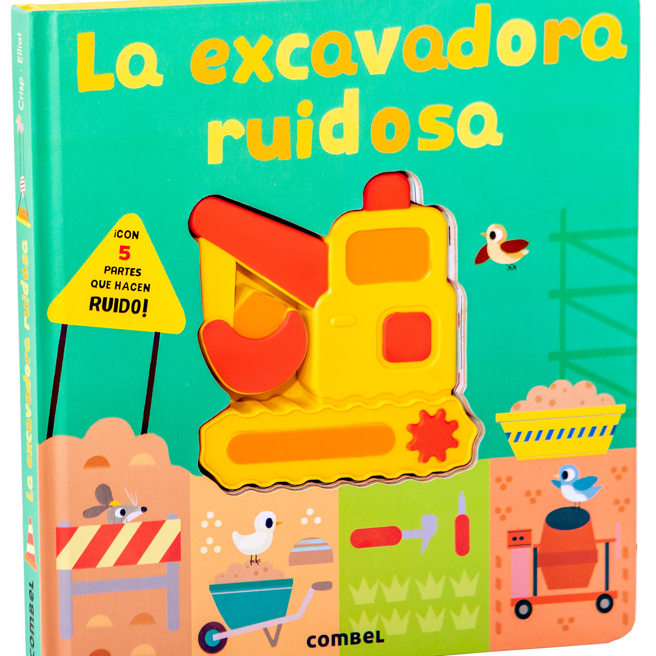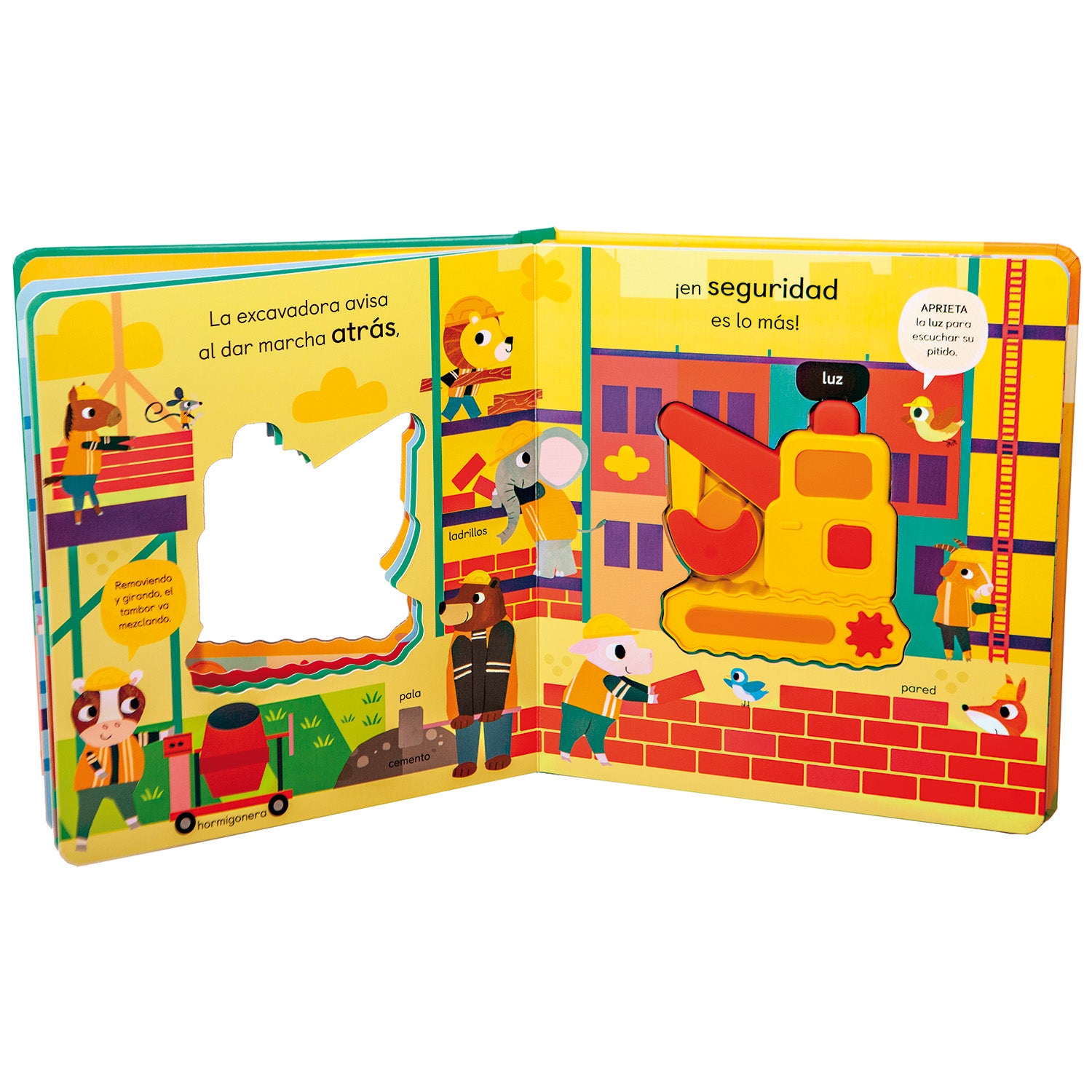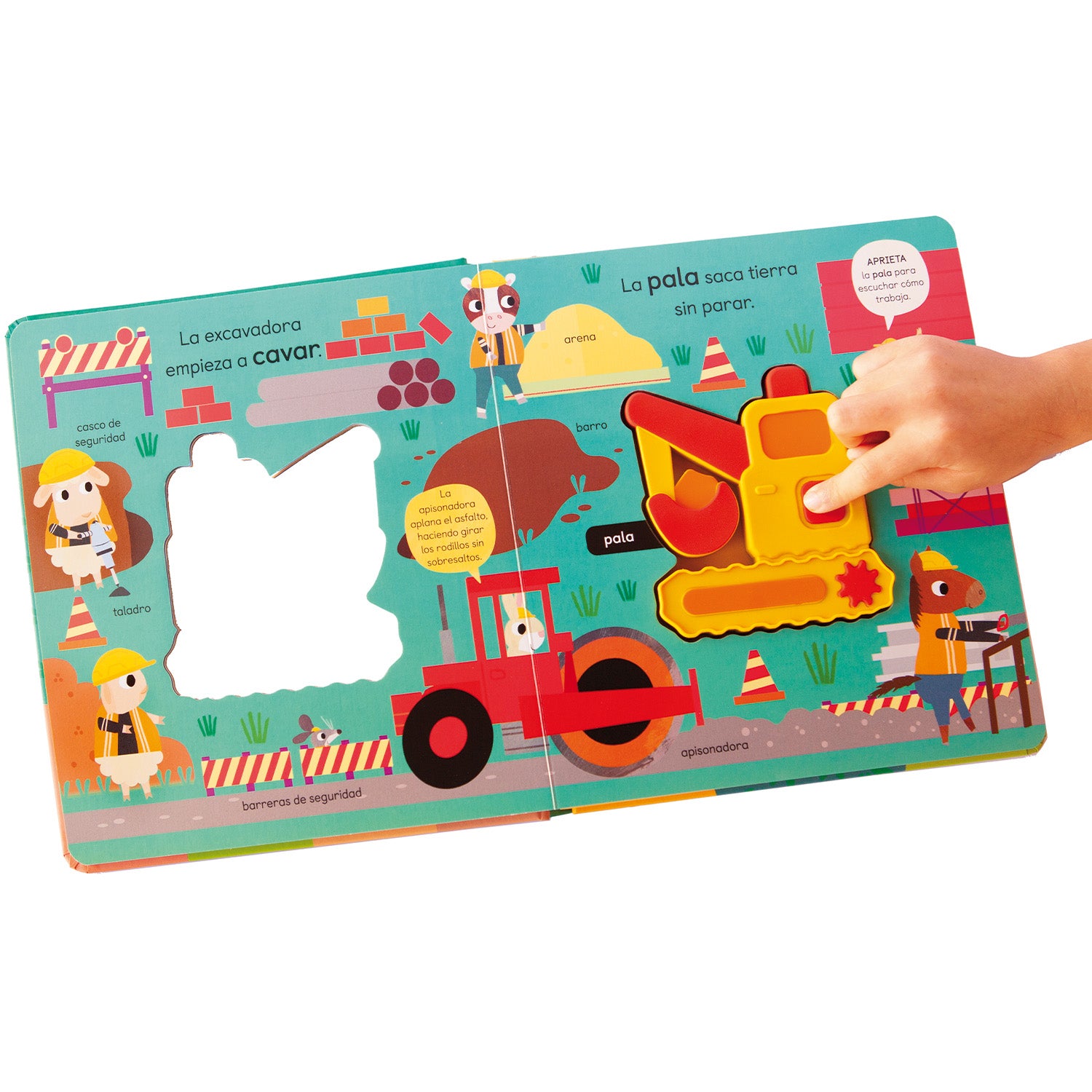 Una excavadora con mecanismos sonoros recorre los escenarios de una obra de construcción donde encontrará a los trabajadores, otros vehículos como la grúa o el camión y herramientas como el taladro o los ladrillos. A los niños y a las niñas les encantará apretar las partes blandas de esta excavadora para escuchar los sonidos de la luz giratoria, de las ruedas ¡y hasta del motor!