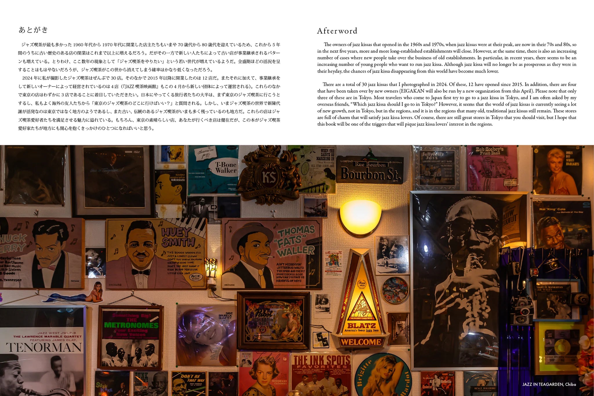 Una colección de fotografías que presentan 30 jazz kissa en Japón, tomadas en 2024. "Recuerdos del jazz kissa en 2024". Un fotolibro que es la continuación de "Jazz Kissa 2014" Vol. 1 y Vol. 2, que presentó un total de 136 jazz kissa en el este de Japón.