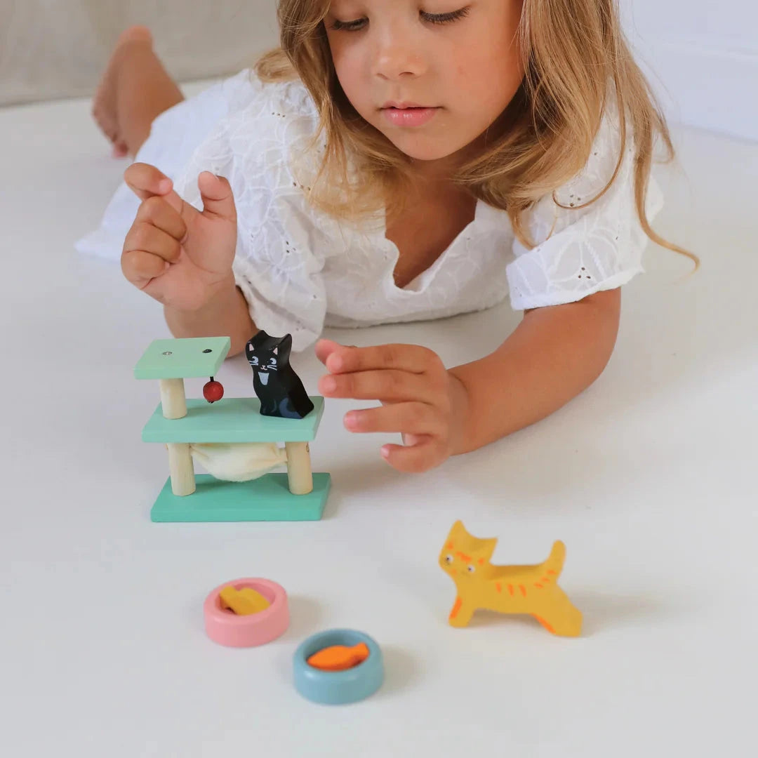 2 pequeños gatos, uno negro y otro pelirrojo, con mesa de juego y pelota para divertirse. ¡2 cuencos de diferentes colores, cada uno con un pez para cenar! Adecuado para todas las casas de muñecas de madera, a escala 1:12.