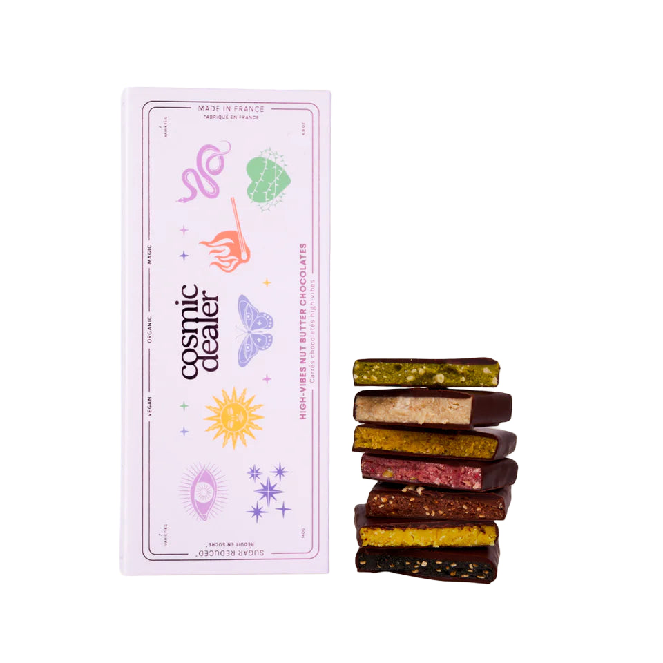 A variety of healthy nut and seed butter squares, dipped in raw dark chocolate and microdosed with functional botanicals.