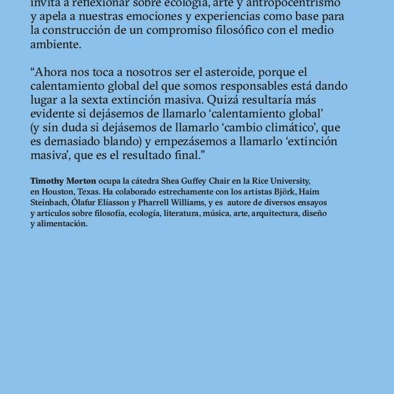 With his personal and provocative style, through these short essays the English philosopher Timothy Morton invites us to reflect on ecology, art and anthropocentrism and appeals to our emotions and experiences as a basis for building a philosophical commitment to the environment.