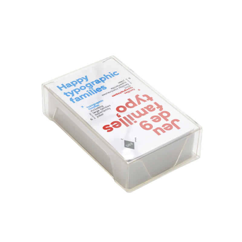 Mejora tus conocimientos sobre tipografía y familias tipográficas con un juego de cartas. Basada en la clasificación oficial Vox-AtypI, desarrollada en 1954 por Maximilien Vox (1894-1974), esta baraja presenta cada familia tipográfica en detalle, incluyendo sus orígenes, características, contexto histórico y más. Además de estas nueve familias, puedes descubrir las tipografías destacadas a través de ejemplos que contienen y revelan diversos episodios de la historia de la tipografía. El juego también ofrece un retrato del diseño tipográfico a lo largo de los siglos y ofrece una visión del diseño tipográfico contemporáneo presentando diversos desarrollos recientes de fundiciones de renombre internacional.