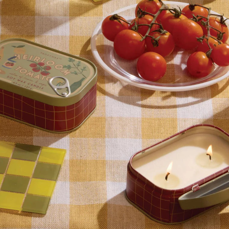 Vela de dos mechas en caja metálica, imitando una lata de conservas, para darle más personalidad y una ilustración. Ya sea que estés buscando infundir tu espacio con una fragancia deliciosa o buscando el regalo perfecto, esta vela en lata ofrece un brillo acogedor en cada hogar.