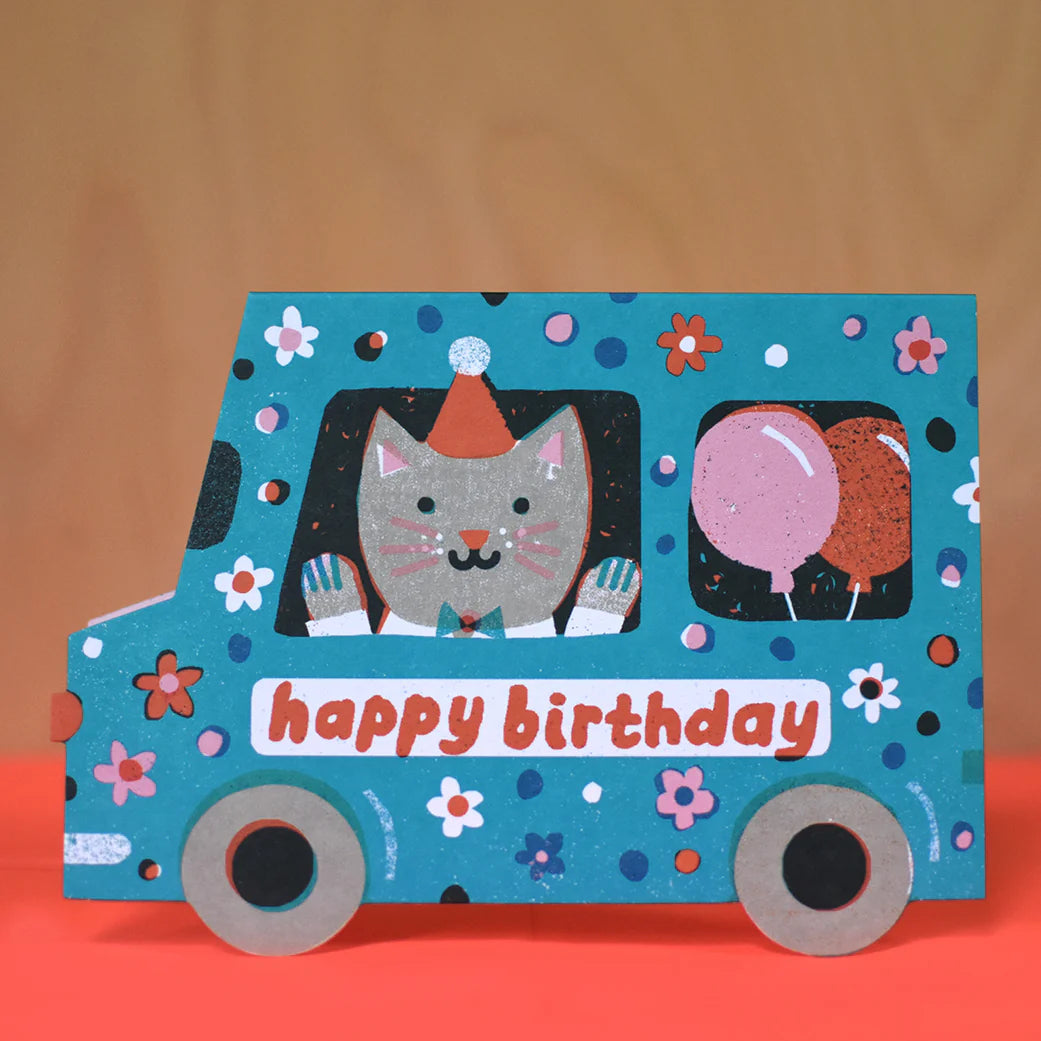 Vroom vroom, get the balloons out! Here comes a happy birthday card shaped like a van, with a cat ready to party!