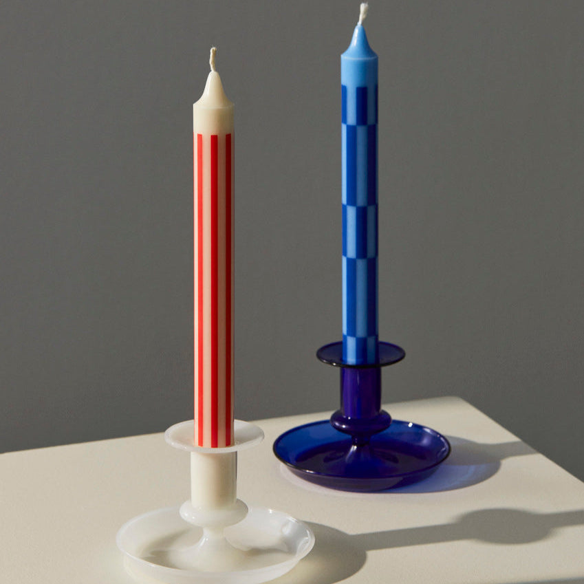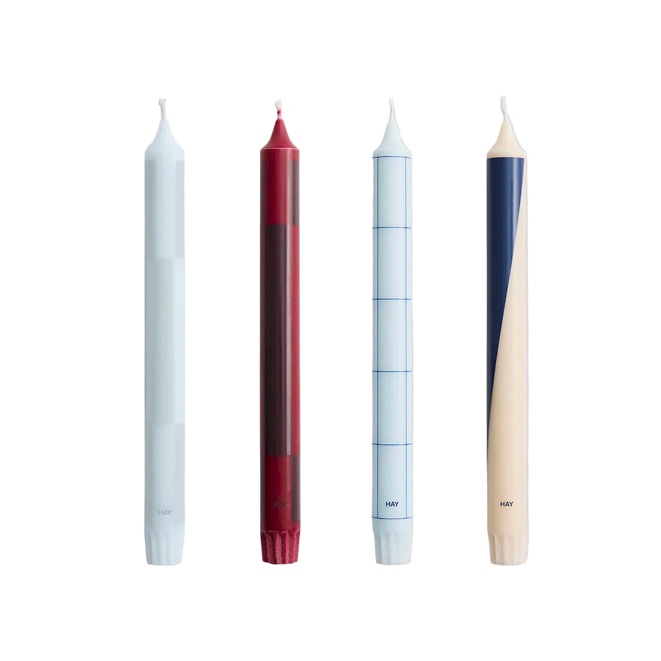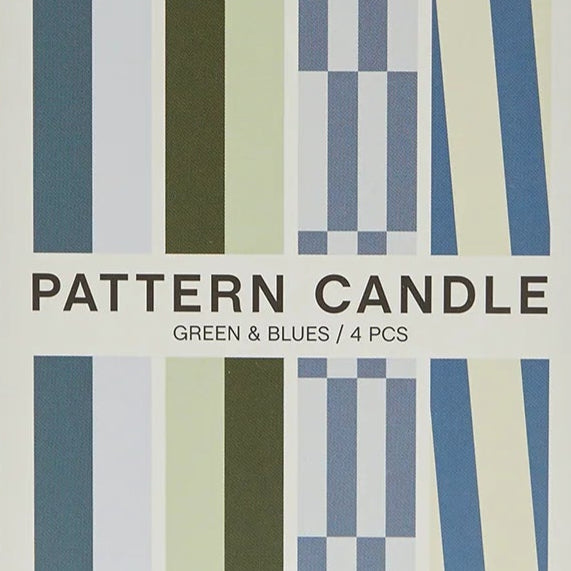 Pack de 4 velas estampadas en diferentes colores, anchos y direcciones, que aportan un toque distintivo y contemporáneo a la vela clásica que las hace ideales para decorar cualquier rincón.