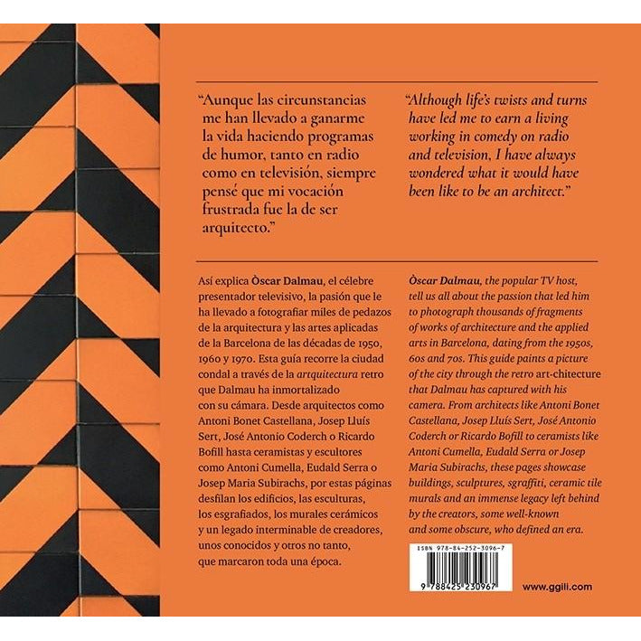 This is how Òscar Dalmau, the famous television presenter, explains the passion that has led him to photograph thousands of pieces of architecture and applied arts in Barcelona from the 1950s, 1960s and 1970s. This guide covers the city through the retro architecture that Dalmau has immortalized with his camera. From architects like Antoni Bonet Castellana, Josep Lluís Sert, José Antonio Coderch or Ricardo Bofill to ceramicists and sculptors like Antoni Cumella, Eduald Serra or Pau Macià i Pons, buildings, sculptures, sgraffito, ceramic murals and an endless legacy of creators, some well-known and others not so much, who marked an entire era.