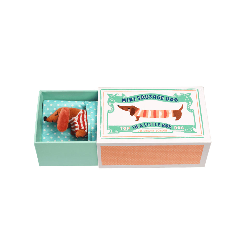 ¡A los más pequeños les encantará cuidar de este adorable perro salchicha! Este tierno peluche de Dachshund viene con su propio jersey de rayas y su manta de lunares, todo dentro de una caja de regalo ilustrada.