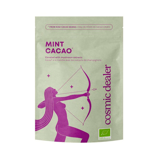 Mint Cacao de Cosmic Dealer es una experiencia celestial en taza. Cacao crudo de Santo Tomé se encuentra con menta fresca y lúcuma, creando notas sutiles de caramelo. Potenciado con melena de león, reishi y maitake orgánicos de máxima calidad. Prepáralo caliente o frío: disuelve 2 cucharaditas en agua caliente, añade tu leche favorita y bate. Perfecto para las noches o después de comer. ¡Que comience el viaje cósmico!