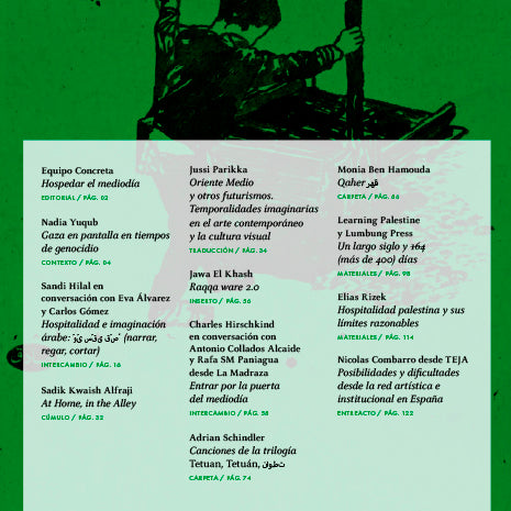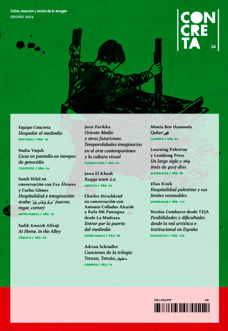 Desde la hospitalidad árabe como práctica de resistencia hasta las imágenes creadas por los pueblos palestinos como actos de generosidad extrema, las contribuciones de Concreta 24 (otoño 2024) abarcan temas como la memoria, la diáspora, los feminismos fluidos y las temporalidades alternativas que desafían las lógicas modernas. Los ensayos y propuestas visuales dialogan con legados culturales árabes, andalusíes y decoloniales, proponiendo un imaginario geopolítico que entrelaza tradiciones transnacionales y diaspóricas, mientras exploran nuevas posibilidades éticas y estéticas frente a las estructuras narrativas dominantes. Cuenta con la colaboración de Nadia Yuqub, Sandi Hilal (DAAR), Eva Álvarez, Carlos Gómez, Jussi Parikka, Charles Hirschkind, Antonio Collados, Rafa SM Paniagua (La Madraza), Adrian Schindler, Monia Ben Hamouda, Elias Rizek, Sadik Kwaish Alfraji, Jawa El Khash, Learning Palestine, Lumbung Press, Nicolás Combarro (TEJA).
