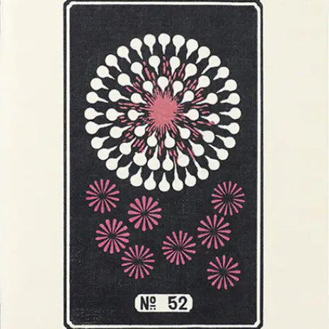 Estas imágenes proceden de un catálogo publicitario de los fuegos artificiales Hirayama, publicado alrededor de 1890 por C. T. Brock & Co., el fabricante de pirotecnia más antiguo de Gran Bretaña, fundado en 1698. Los fuegos artificiales, inventados en China alrededor del siglo II a. C. y que aparecieron en Japón alrededor de 1600 bajo el nombre de hanabi ("flores de fuego"), se desarrollaron y florecieron en el siglo XIX durante el período Edo (rebautizado como Tokio en 1868). Hirayama Jinta amplió los tradicionales fuegos artificiales en cascada de color naranja con una amplia gama de diseños originales y colores vivos. Estas ilustraciones simplificadas les confieren una impactante dimensión gráfica.