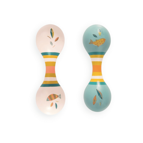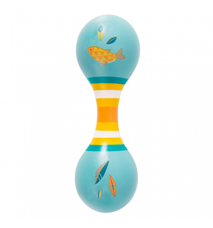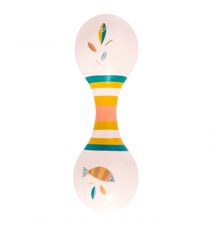 Maraca doble con ilustraciónes de la colección El Viaje de Olga, es de madera y la puedes elegir entre dos colores, blanco o azul.