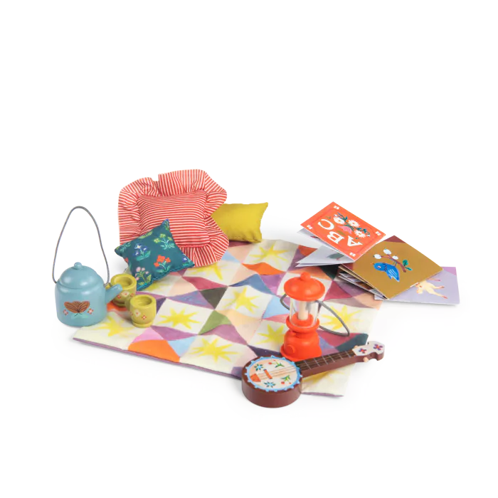 Hoy llueve... ¡genial! Cojines suaves, una taza de té y cuentos.. Contenido: banjo, manta, linterna, tetera, dos tazas de madera, tres libros y tres cojines.