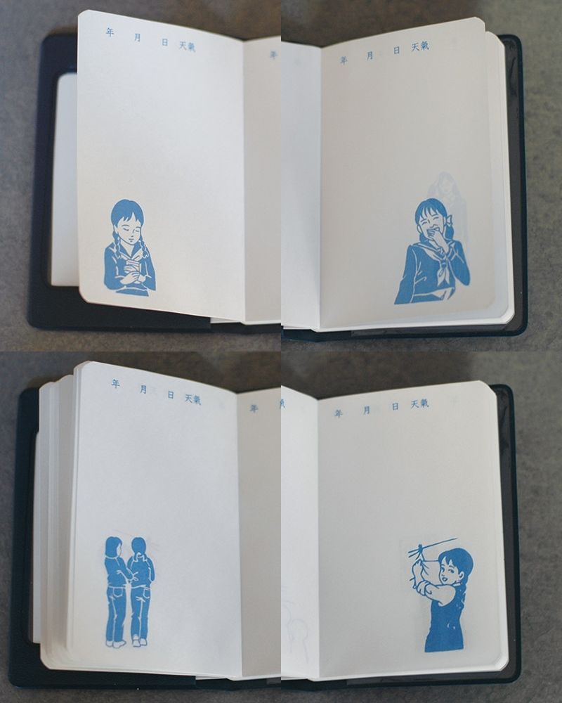 Esta libreta y cada una de sus páginas han sido decoradas por la ilustradora Nancy Seki (1962-2002) con tiernas escenas inspiradas en la vida escolar. La parte interior de la tapa permite insertar una foto.