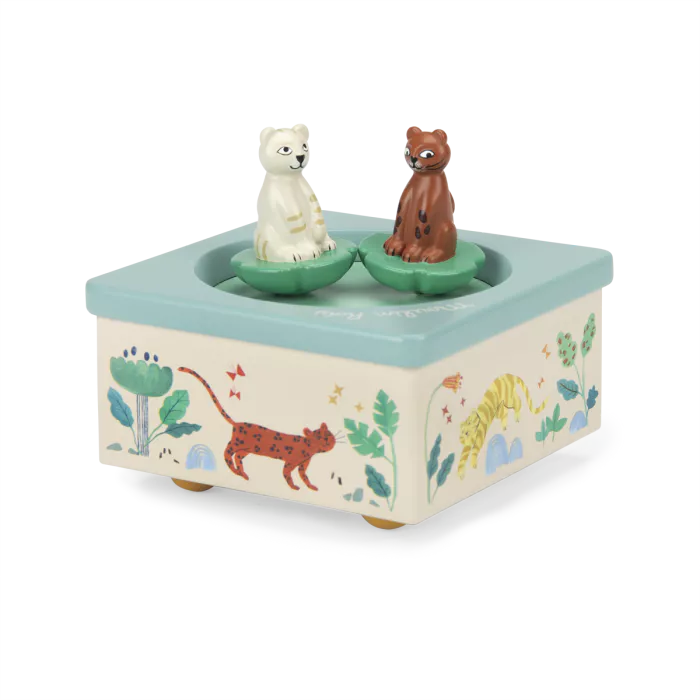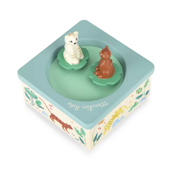 Babou y Taïgo giran al ritmo de la nana para arrullar suavemente a tu hijo hasta que se duerma. La caja de música está bellamente ilustrada en acuarela por Élodie Coudray.
