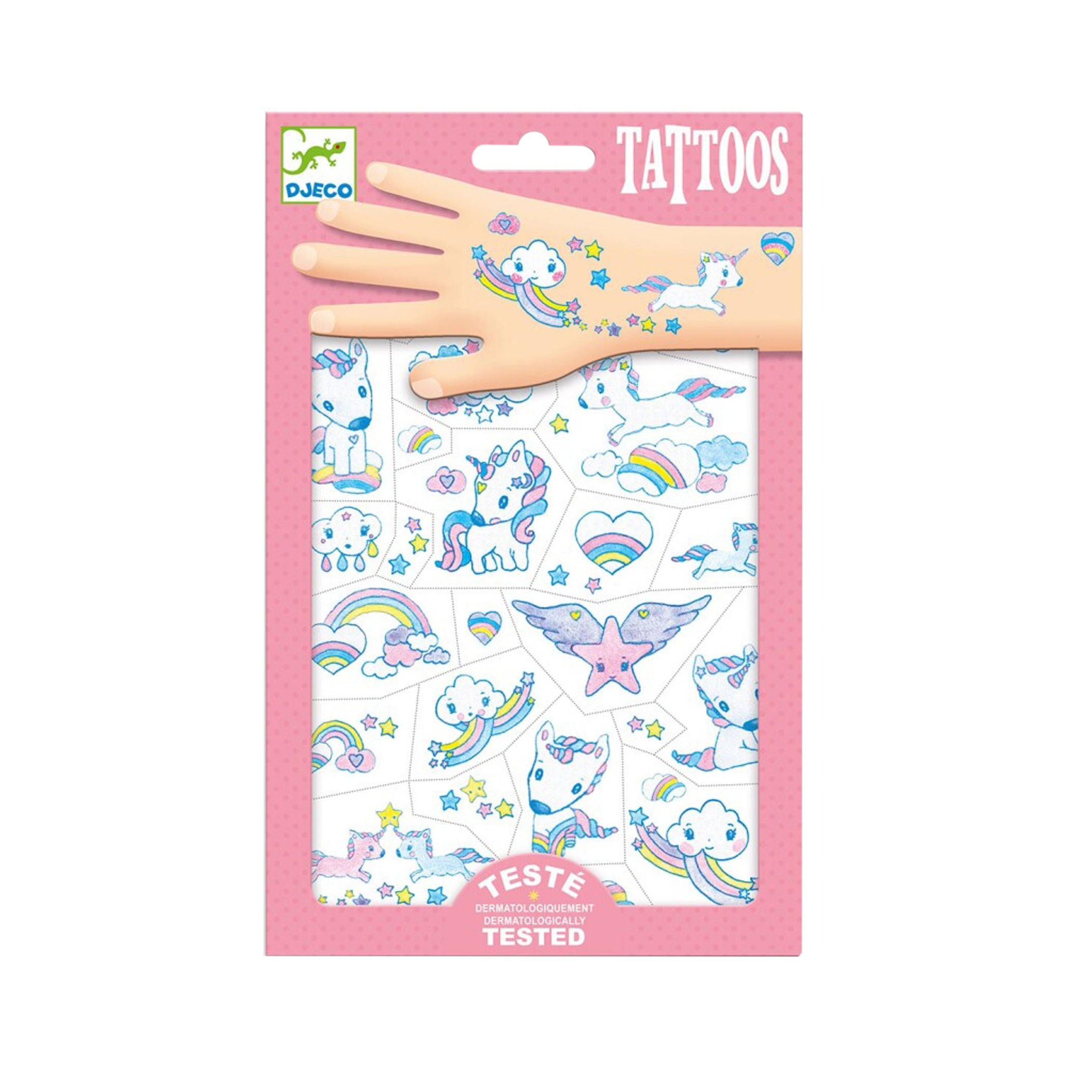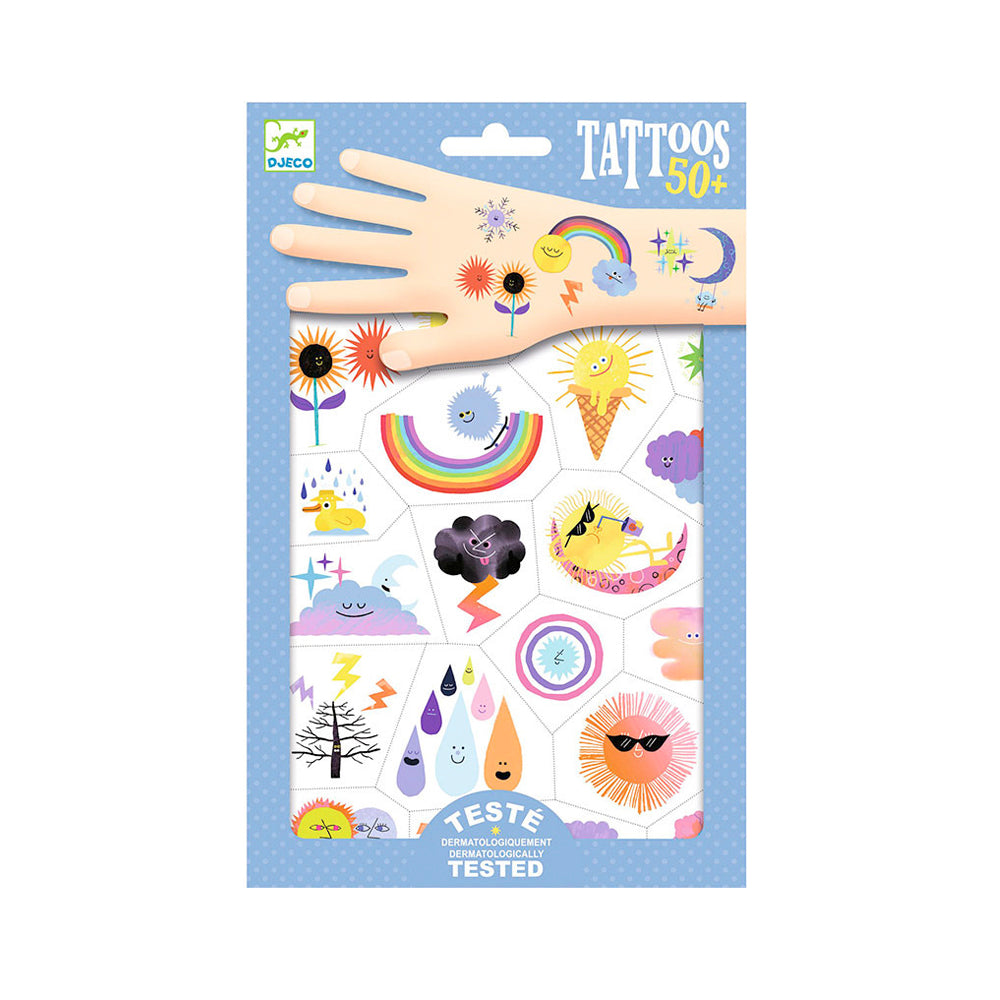 ¡Dos hojas de tatuajes temporales sobre el arco iris para deleitar a los peques! Son fáciles de usar, están precortados y se aplican con un poco de agua. Tatuajes probados dermatológicamente. Se quitan con agua con jabón o con un desmaquillador suave.