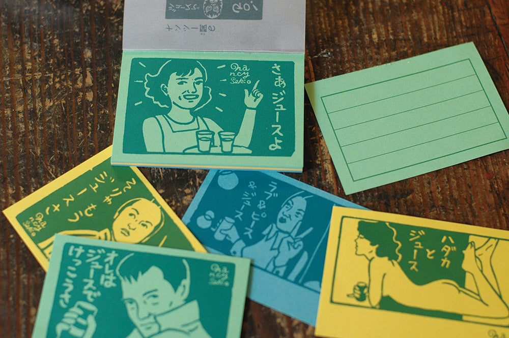 Es un bloc de notas que se pueden arrancar las páginas, y cada página tiene un dibujo de Nancy Seki. En la sociedad japonesa, existe la costumbre de que si puedes beber alcohol eres un adulto respetable, pero esta tarjeta con mensaje dice "Vamos con zumo", así que está bien si no puedes tomar alcohol. Escribe una nota sencilla o di las palabras que querías decir.