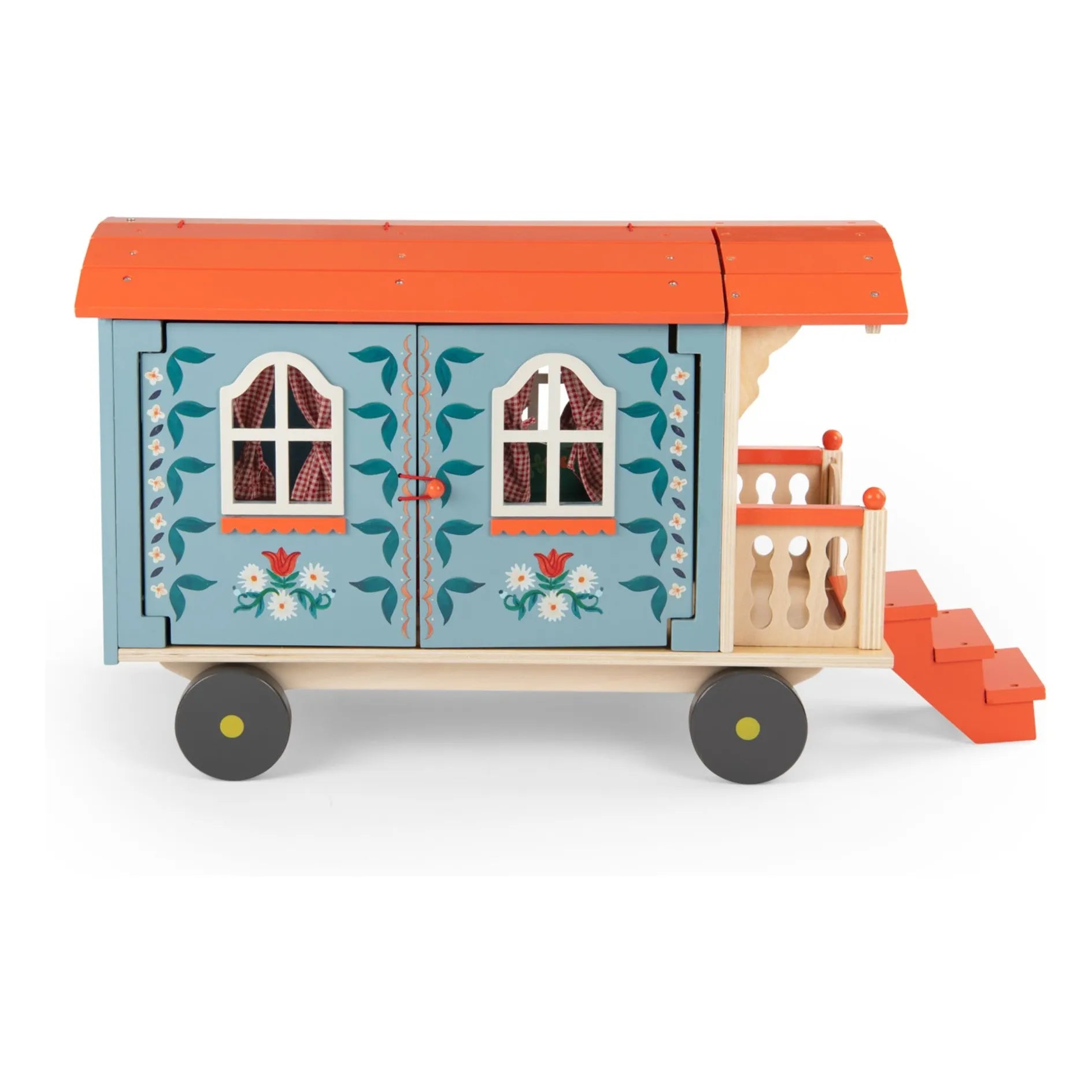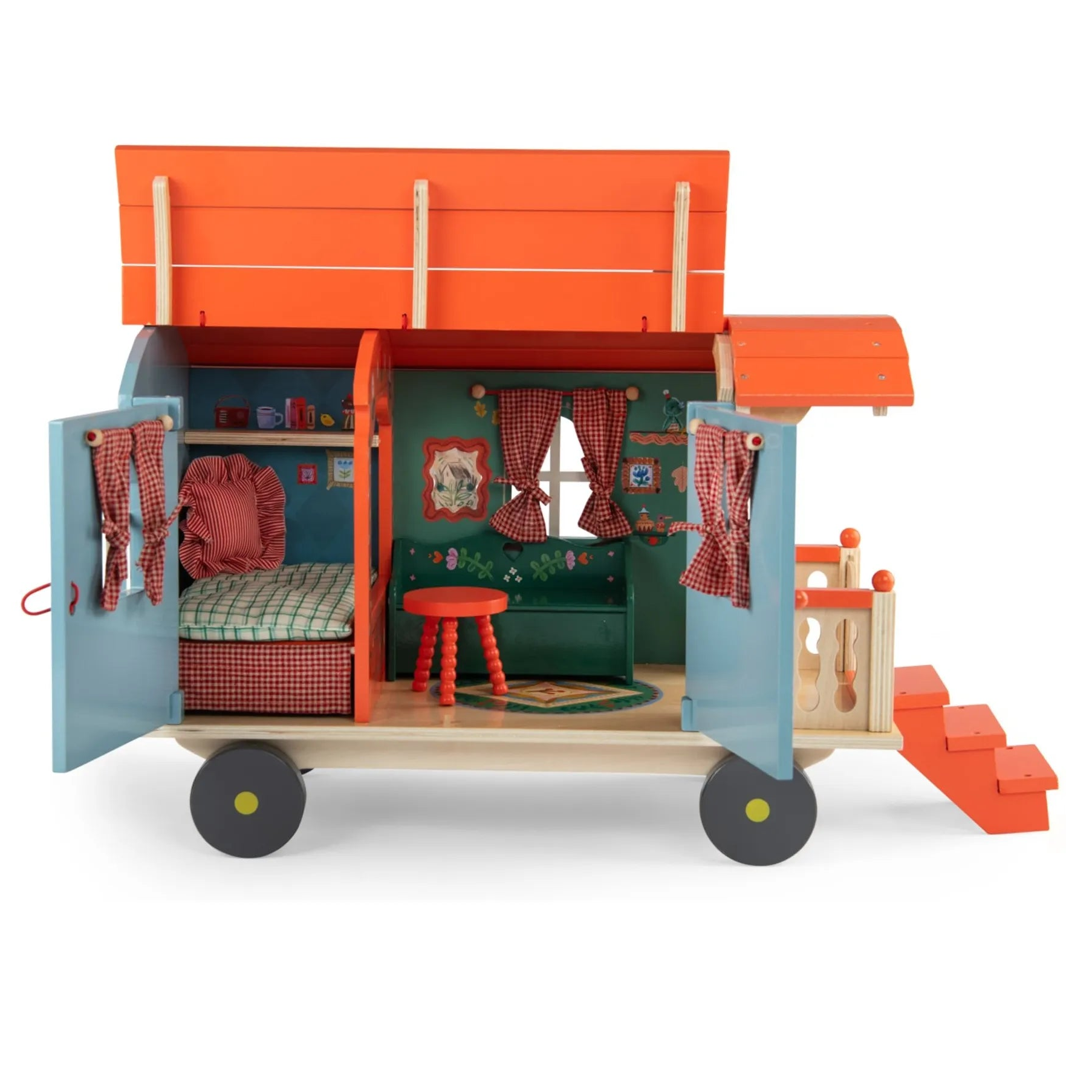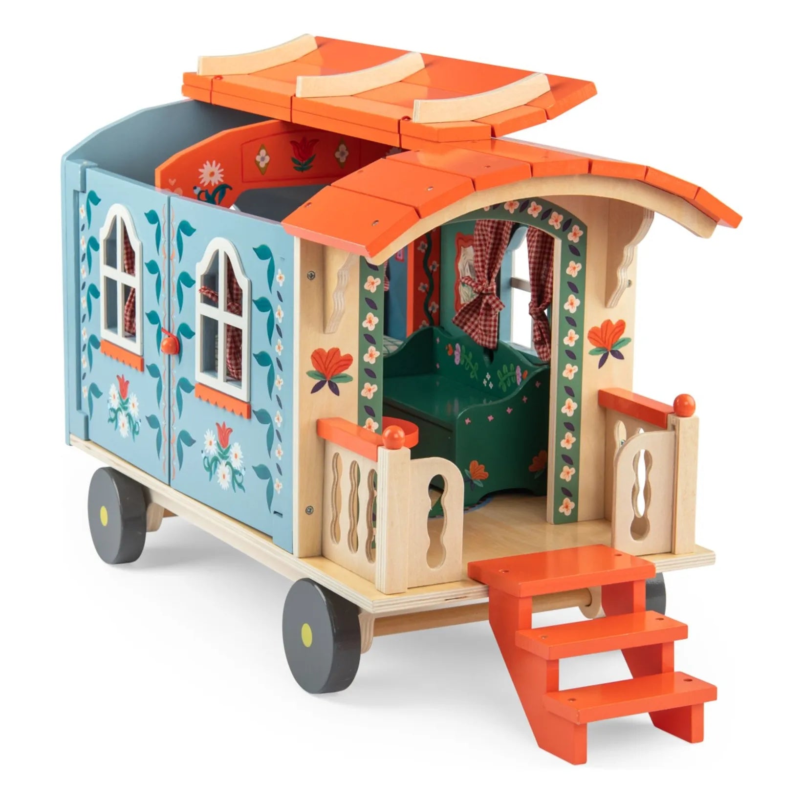 Caravana de madera de la colección colección Les Minouchkas. ¡Pasen y vean! La colorida caravana de madera de Baba, de la encantadora colección Les Minouchkas de Moulin Roty, está lista para recibir a sus amigos para una velada de cuentos y juegos. Decorada con bonitos detalles florales, ventanas brillantes y un alegre techo rojo, incluso tiene una pequeña escalera y un balcón para darle un toque especial.