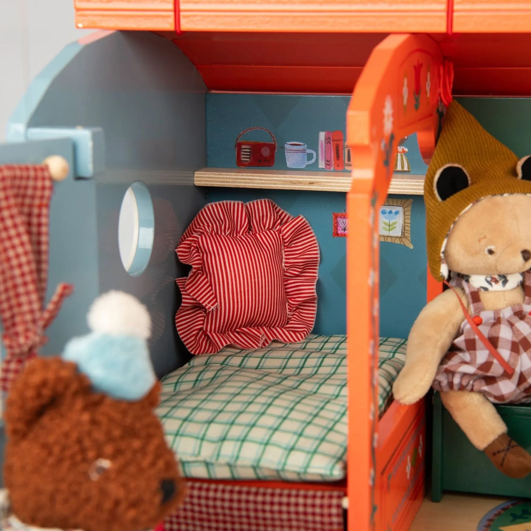 Esta caravana de madera, una verdadera joya, se abre para dar rienda suelta a la imaginación y tiene el tamaño perfecto para los personajes de Les Minouchkas (se venden por separado). Un juguete precioso para atesorar y heredar de generación en generación.