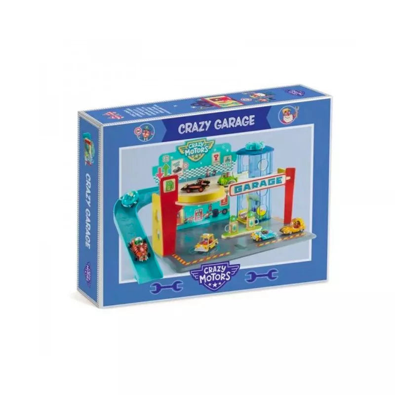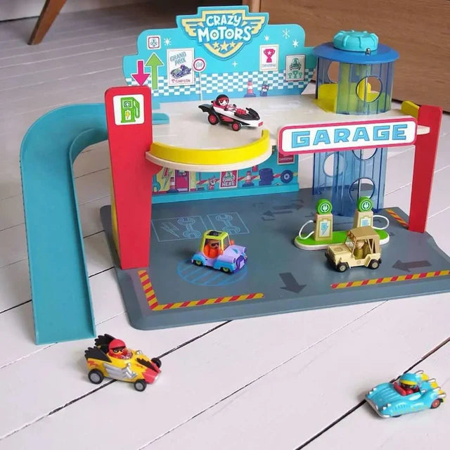 Garaje para coches de la colección Crazy Motors. Con ascensor, rampa, taller, aparcamiento y mucho detalles para jugar. Niños y niñas disfrutarán durante horas del juego simbólico con este fantástico garaje con estación de servicio, que podrán llenar con todos sus vehículos.
