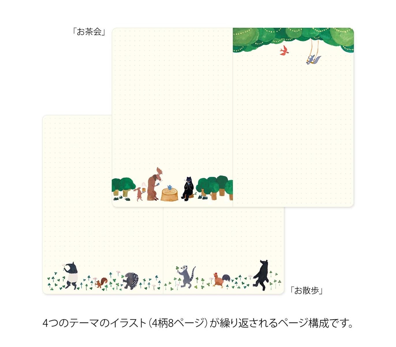 Es un cuaderno que hace que escribir y mirar hacia atrás sea aún más agradable. Cada página de la cuadrícula de puntos tiene ilustraciones para agregar color a sus registros. El diseño Forest Animal presenta animales únicos en un mundo similar a un libro de cuentos. Cada página presenta un diseño diferente bajo cuatro temas: "Paseo", "Concierto", "Fiesta del té" y "Panadería".
