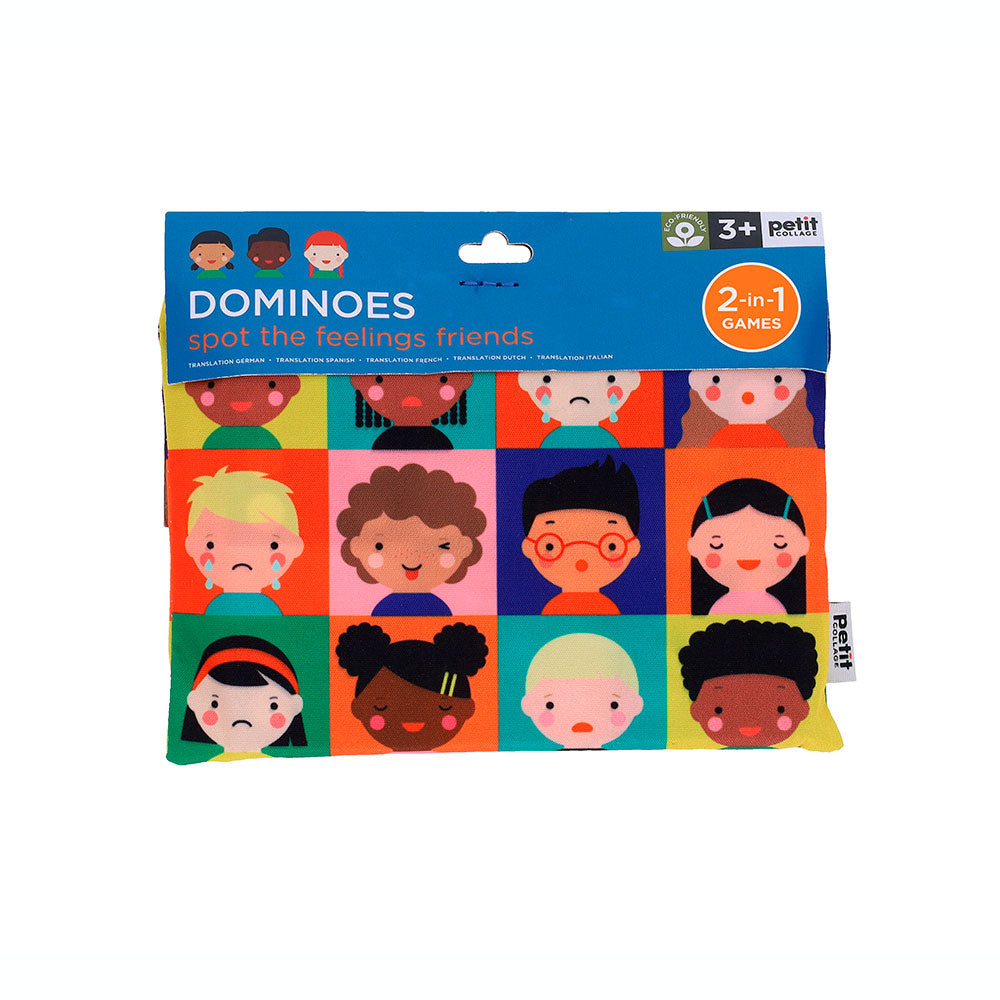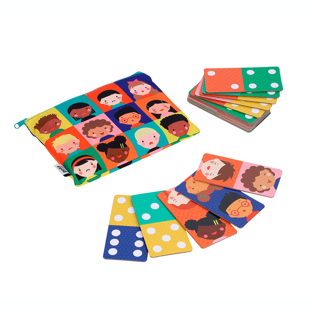 En este juego de dominó de sentimientos, los más pequeños deben detectar la emoción coincidente (feliz, triste, tranquilo, etc.) y nombrar el sentimiento de su pareja, fomentando el desarrollo de habilidades de inteligencia emocional. Este es el clásico juego de dominó... con un giro, cada jugador se turna para agregar una ficha de dominó para que coincida, pero no hay dos imágenes de dominó exactamente iguales. Empareja y luego encuentra la diferencia entre los dos dibujos. Incluye 28 cartas de dominó con los tradicionales puntos en el reverso fabricadas utilizando un 80% de papel reciclado. El juego viene dentro de una práctica bolsita con cremallera, hecha de polyester reciclado, para llevarlo y jugar donde prefieras.