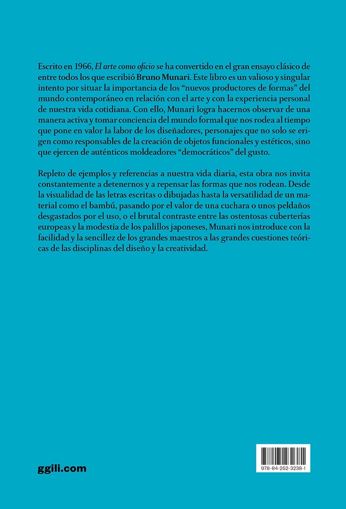 Escrito en 1966, El arte como oficio se ha convertido en el gran ensayo clásico de entre todos los que escribió Bruno Munari. Este libro es un valioso y singular intento por situar la importancia de los “nuevos productores de formas” del mundo contemporáneo en relación con el arte y con la experiencia personal de nuestra vida cotidiana. Con ello, Munari logra hacernos observar de una manera activa y tomar conciencia del mundo formal que nos rodea al tiempo que pone en valor la labor de los diseñadores, personajes que no solo se erigen como responsables de la creación de objetos funcionales y estéticos, sino que ejercen de auténticos moldeadores “democráticos” del gusto.