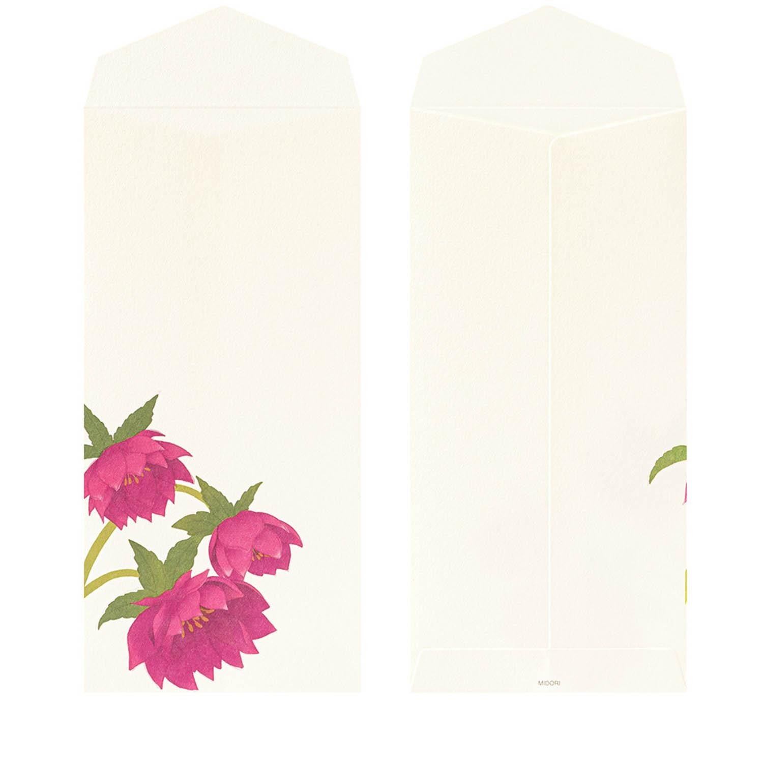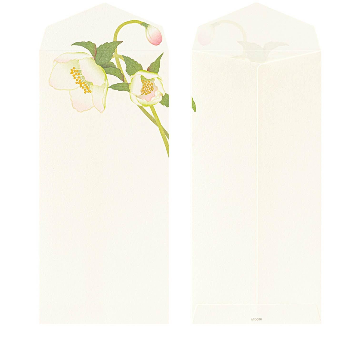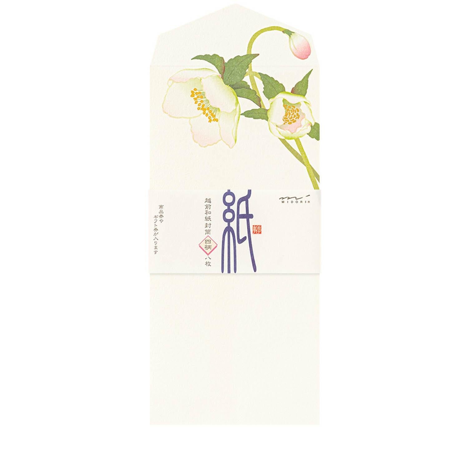 Este sobre de felicitación de temporada, elaborado con papel japonés tradicional (washi) que se fabrica desde hace más de 1000 años, presenta flores de invierno en composiciones llamativas. Viene con cuatro variedades de rosas navideñas que florecen con gracia en un juego surtido. Está hecho con el Washi Echizen de textura suave, "Echizen Torinoko".