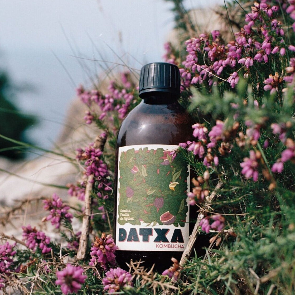 Ingredientes: Agua filtrada, cultivo de kombucha, té verde Sencha*, azúcar de caña rubio sin refinar*, hojas de higuera*.