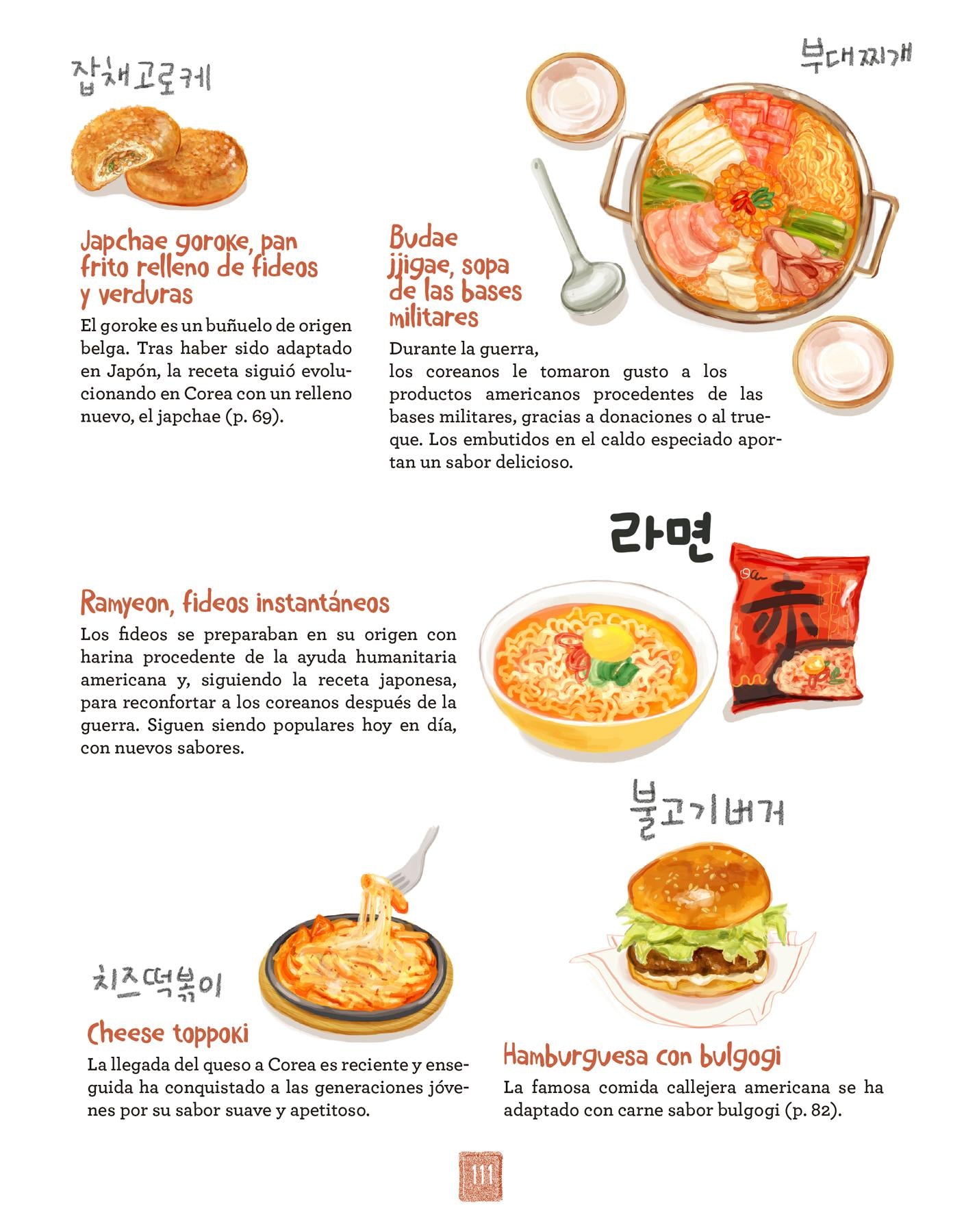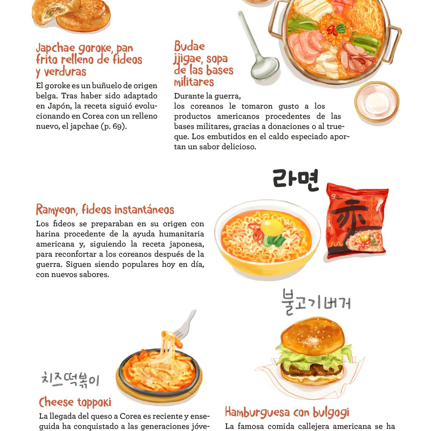 Anécdotas, gestos, mapas, utensilios, ingredientes ¿De qué se compone una comida cotidiana? ¿Cuáles son las reglas del saber vivir? ¿Por qué en Corea son tan apreciados los ingredientes fermentados? ¿Qué ingredientes componen un bibimbap? ¿Cuál es el secreto del pollo frito coreano? ¿Cuáles son los rituales familiares más importantes, los alimentos de la suerte, la comida callejera y los postres más apreciados? En un abrir y cerrar de ojos encontrarás todas las respuestas. Sin olvidar recetas deliciosas de kimchi, sopas, arroz frito, fideos con verduras, cerdo marinado, raviolis, bulgogi de ternera, calamar relleno, pastel de arroz.