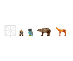 - 25 piezas translúcidas de colores que incluyen 11 cuadrados pequeños, 2 triángulos isósceles , 2 triángulos rectos, 6 piezas hierba/árbol, y 4 animales del bosque (1 mapache, 1 buho, 1 oso y 1 cervatillo).