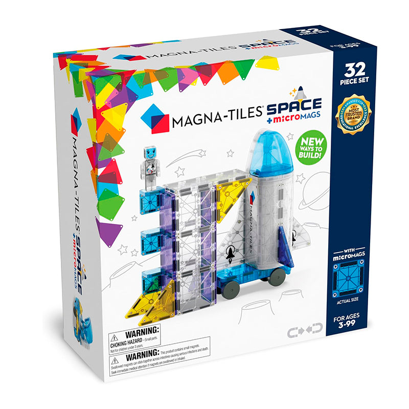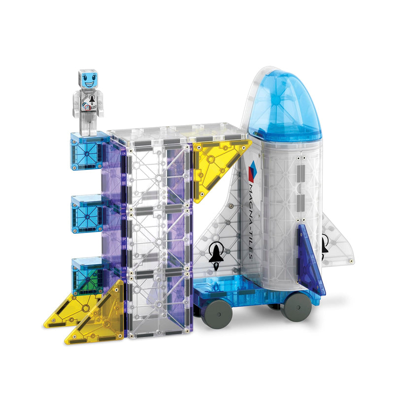 Incluye: 32 piezas magnéticas, incluyendo: 1 transbordador espacial, 1 cápsula espacial, 1 ventana de cápsula, 1 figura espacial, 1 chasis con ruedas, 1 rectángulo grande, 6 cuadrados microMAGS, 8 triángulos rectos, 12 cuadrados.