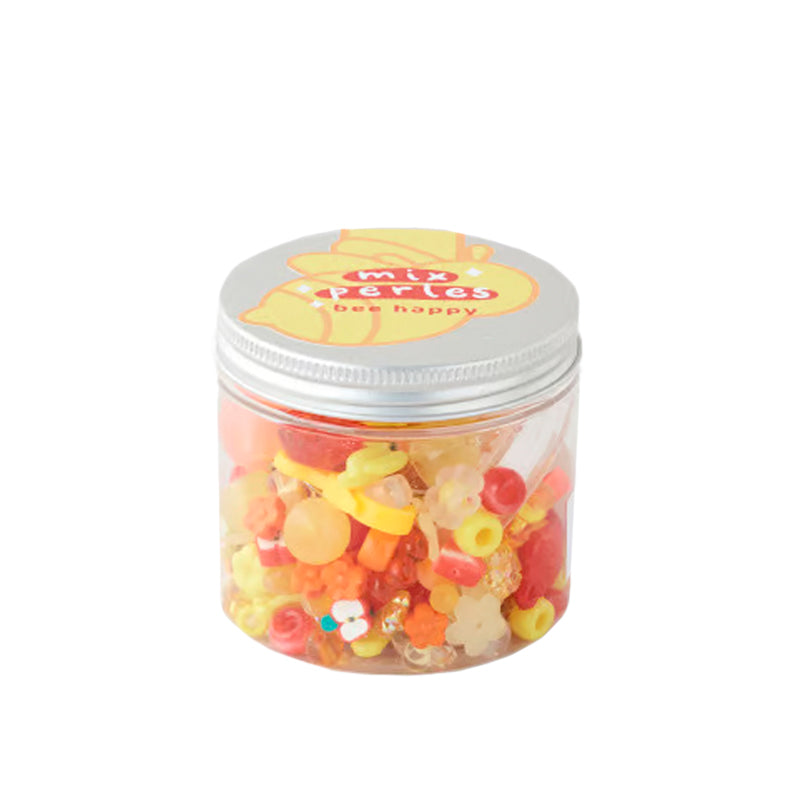 Un bote con diferentes cuentas para hacer pulseras y collares.