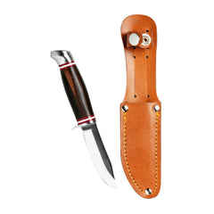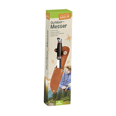 Navaja infantil con punta redondeada. Mango de madera y protección dedos. Incluye funda de cuero.
