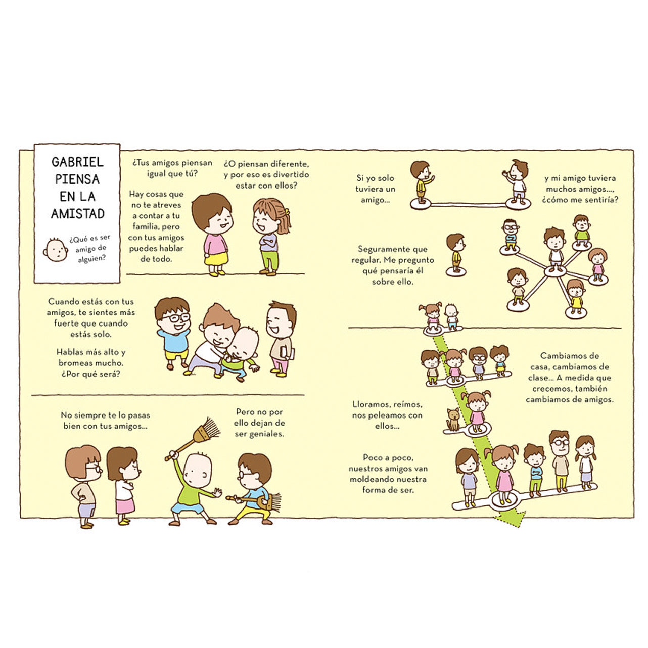 Los personajes de este libro no paran de pensar. ¿Qué es un amigo? ¿Qué tipo de lugar es un colegio? A medida que van encontrándose en su día a día, les van surgiendo nuevas ideas sobre las que pensar. ¿Qué es perdonar? ¿En qué consiste madurar? Seremos partícipes de sus ingeniosos razonamientos y divertidas conclusiones sobre diferentes temas que irán ganando en complejidad a medida que avanza el libro. ¿Qué es la justicia? ¿Qué me hace ser yo?
