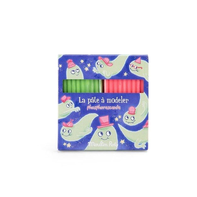 ¡2 plastilinas fosforescentes de color rosa y verde con las que podrás esculpir formas deslumbrantes! Tanto los más pequeños como los grandes de la casa.