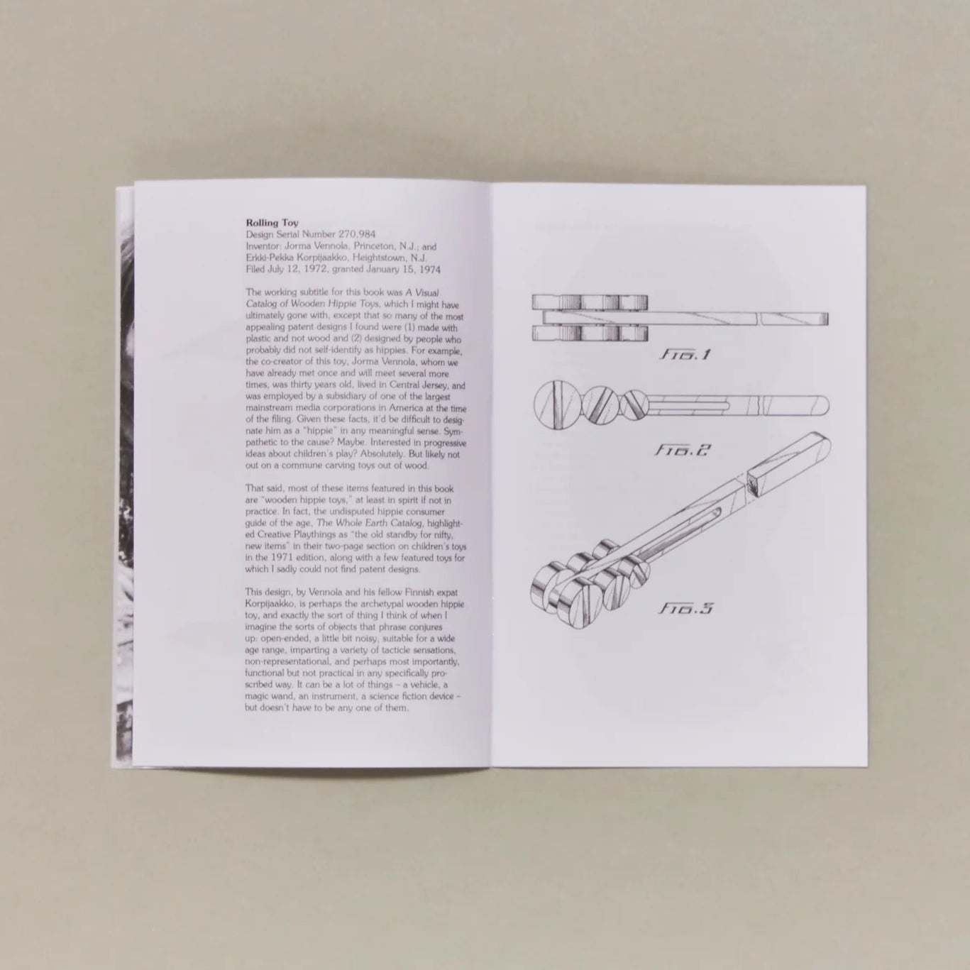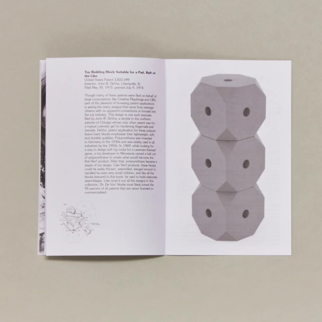 Una colección de más de veinte diseños patentados de juguetes educativos para niños de los años 70 y 80, la mayoría de los cuales nunca llegaron a comercializarse. Los dibujos de patentes son un medio fascinante para el idealismo y la ambición de los aficionados. Ese idealismo se duplica cuando se hojean las solicitudes de patentes de los años 70 y 80 y se observan, a falta de un término mejor, "juguetes progresistas". Estos objetos ingeniosos y excéntricos, diseñados tanto por profesionales como por aficionados, realmente resaltan el interés por el juego abierto que floreció en la era posterior a Acuario antes de que el mercado se inundara de dibujos animados de plástico relacionados con la televisión. Ilustrado con representaciones digitales tridimensionales.
