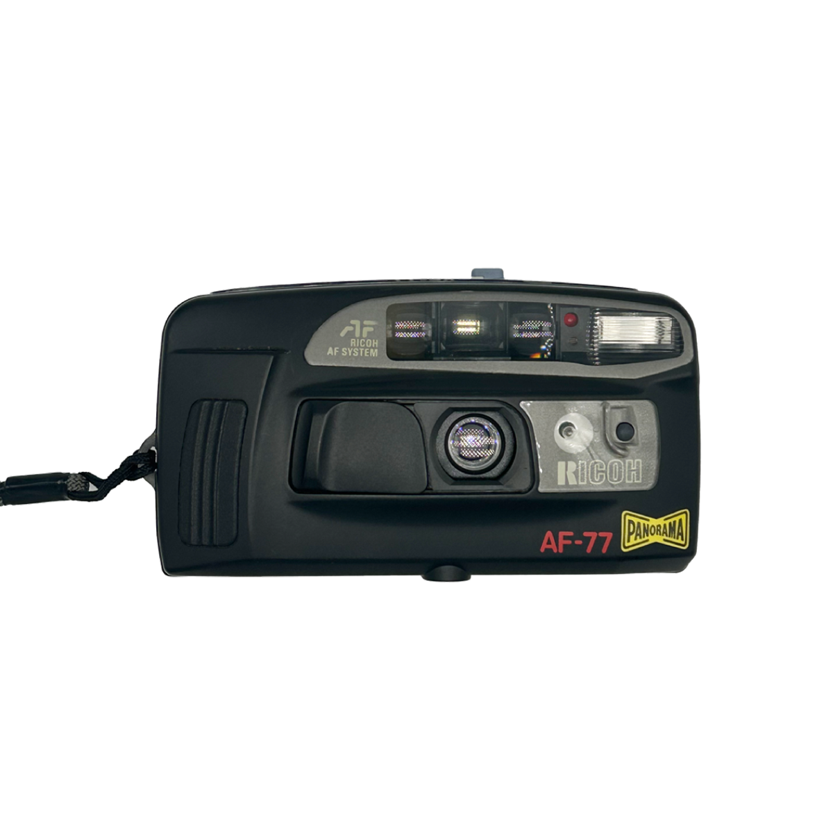 Si buscas una cámara analógica compacta con carácter, la Ricoh AF-77 es una opción estupenda: formato de película de 35 mm, funcionamiento sencillo “point & shoot” y un detalle divertido: modo panorámico de juguete para fotos estilo “barra-ancha”. Ideal para ambientar tus sesiones visuales con estética retro sin complicarte con ajustes.