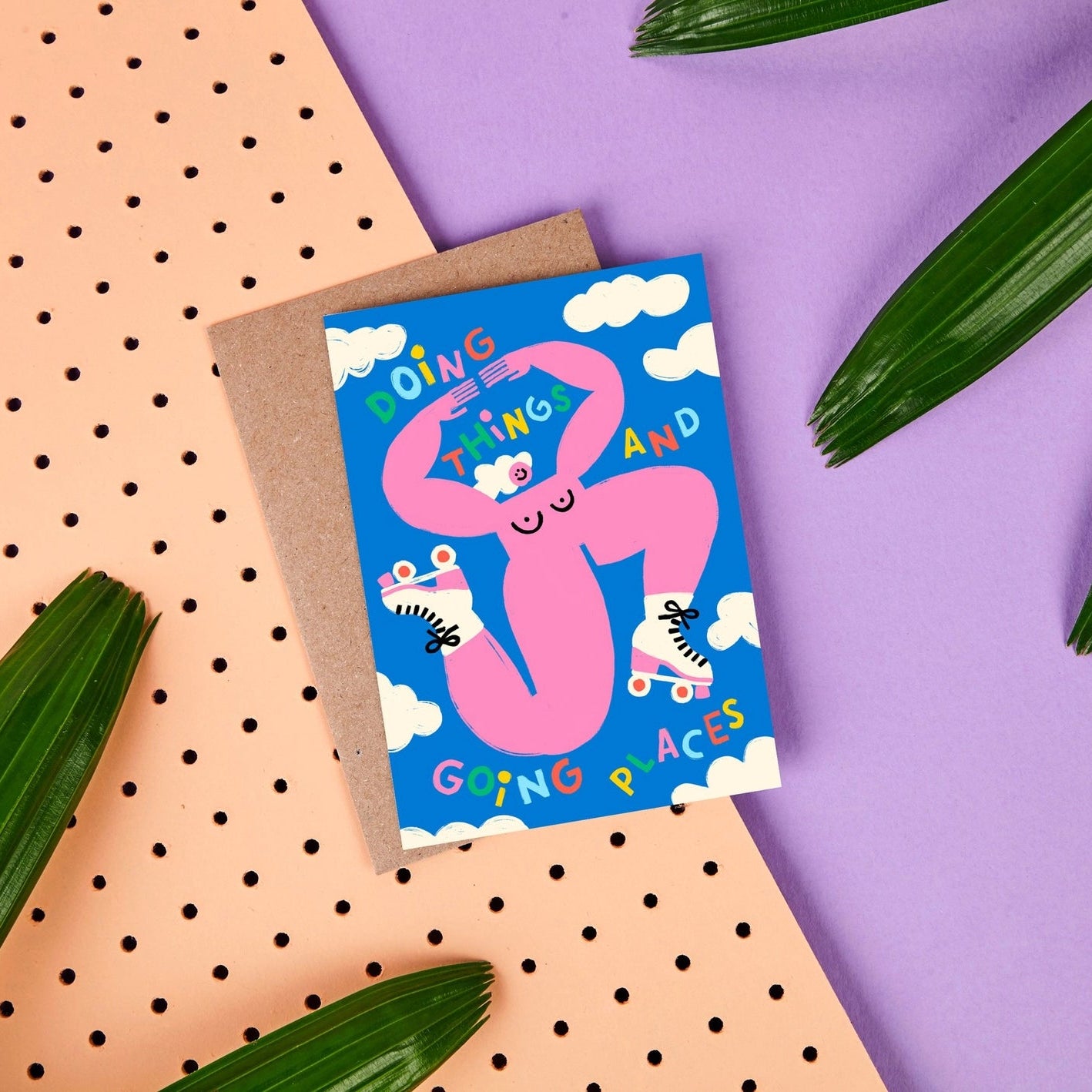 Tarjeta motivacional «Doing Things and Going Places» diseñada por Kelli Laderer. Tarjeta de felicitación A6 impresa en papel de 300 g/m² con certificación FSC de fuentes sostenibles, interior en blanco, combinada con un sobre reciclado marrón.
