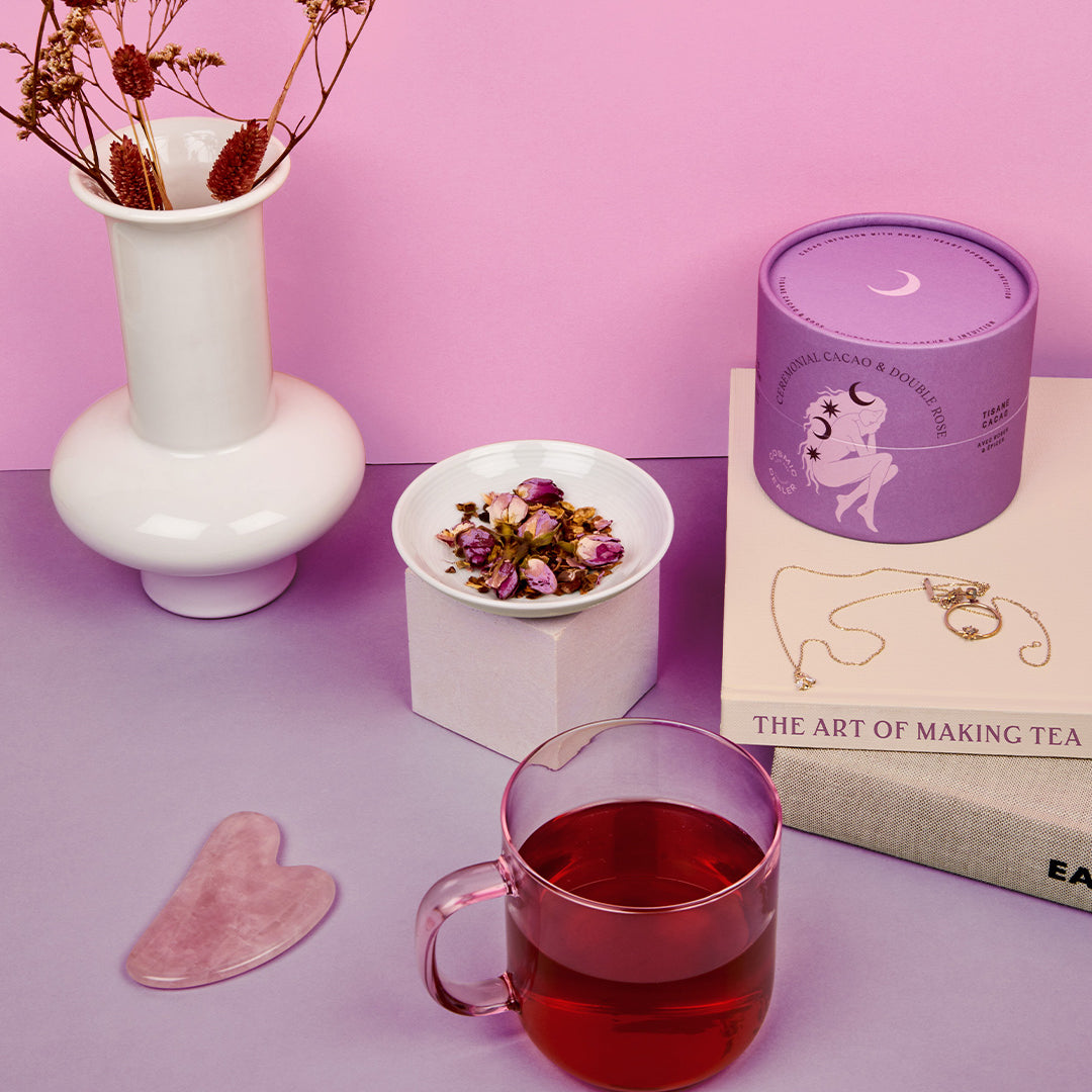 - Intuición - Ceremonial Cacao and Double Rose: Infusión de virutas de cacao crudo con capullos de rosa, pétalos, jengibre, canela y regaliz.