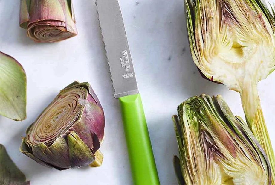 Eficacia, praticidad et manejabilidad: la caja Trio les Essentiels + reagrupa un cuchillo de puntilla, un cuchillo de sierra y un pelador. Con sus mangos de polimero de colores, resistentes al lavavajillas, aportarán un toque alegre a tu cocina.