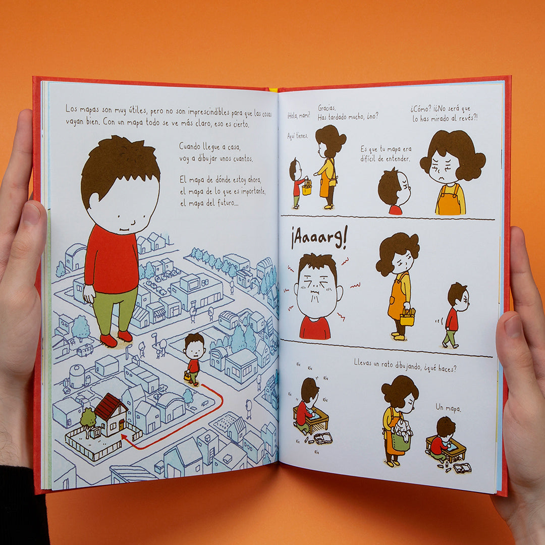 Cuando no sabemos dónde estamos, lo más normal es que intentemos orientarnos con un mapa. Aunque a veces no resulte tan sencillo. El protagonista de este álbum deberá aprender a interpretar las claves que le dibuja su madre para hacer un recado y volver a casa. Claro que la verdadera aventura empieza más bien al volver. Entre pregunta y pregunta descubre que puede haber tantos mapas como cosas queramos saber o explicar.